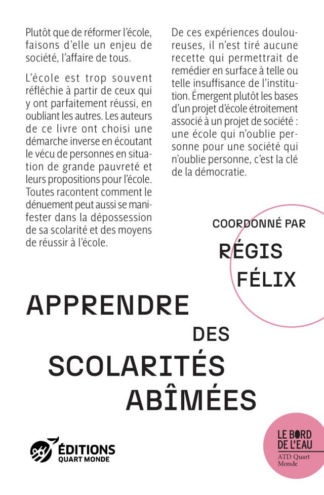 Plutôt que de réformer l’école, faisons d’elle un enjeu de société, l’affaire de tous. L’école est trop souvent réfléchie à partir de ceux qui y ont parfaitement réussi, en oubliant les autres. Les auteurs de ce livre ont choisi une démarche inverse en écoutant le vécu de personnes en situation de grande pauvreté et leurs propositions pour l’école. Toutes racontent comment le dénuement peut aussi se manifester dans la dépossession de sa scolarité et des moyens de réussir à l’école. De ces expériences douloureuses, il n’est tiré aucune recette qui permettrait de remédier en surface à telle ou telle insuffisance de l’institution. Émergent plutôt les bases d’un projet d’école étroitement associé à un projet de société : une école qui n’oublie personne pour une société qui n’oublie personne, c’est la clé de la démocratie.